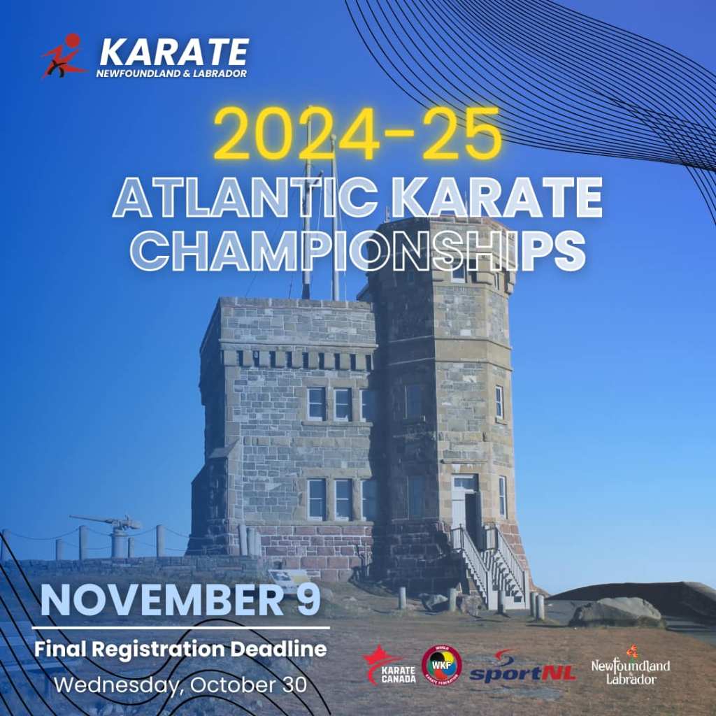 Karate NL is pleased to be hosting karateka from across Atlantic Canada and Saint-Pierre and Miquelon for the 2024-25 Atlantic Championships November 9th, 2024 in St. John’s, NL.